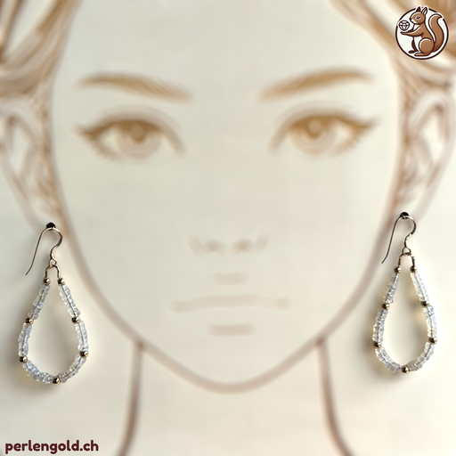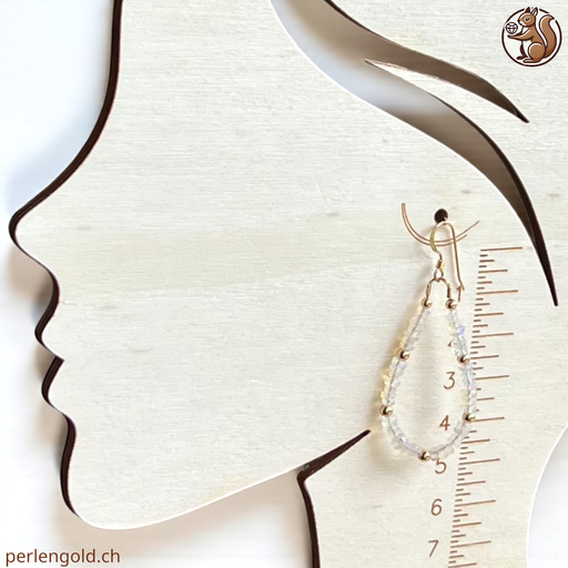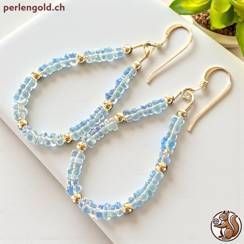 Die auf Juwelierdraht aufgezogenen Steine ergeben federleichte Ohrhänger. Der Drahtschoner rundet den oberen Abschluss ab, an dem die Ohrhaken befestigt werden. Der Schmuckdraht wird durch den Drahtschoner geführt und beidseitig mit einer Quetschperle gesichert, die durch eine Kaschierperle verziert wird, damit die gequetschte Perle nicht sichtbar ist.