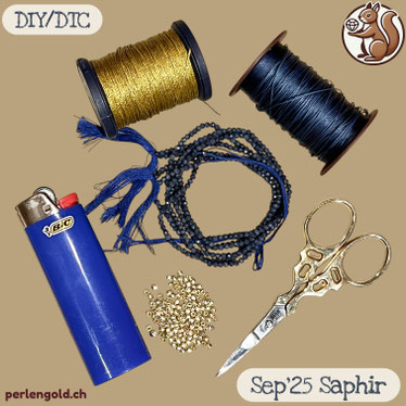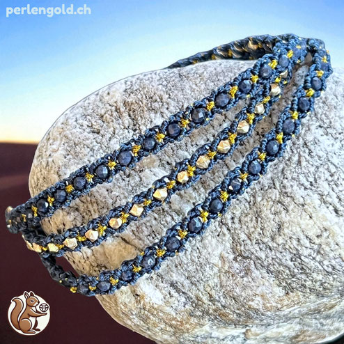 Da ich derzeit intensiv mit den Vorbereitungen für den «Makramée Grundkurs Teil 2» beschäftigt bin, habe ich ein schlichtes Knüpfmuster sowie gewachste Garne in Polyester und Metallic gewählt. Als Stein dient ein filigraner, blauer Saphir.