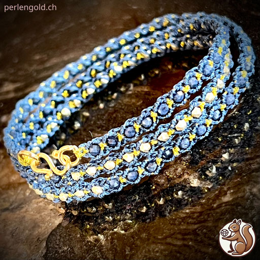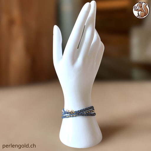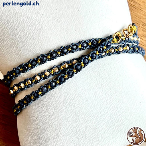 Das Schmuckstück ist ein Wickelarmband mit einer Gesamtlänge von ~51 Zentimetern. Das Besondere daran: Es wirkt wie drei Armreifen. In zwei davon sind Saphir-Perlen eingeknüpft. Den Mittelteil zieren vergoldete Silberperlen, denn laut der Steinheilkunde verstärken Edelmetalle die Wirkung der Mineralien und so lohnt es sich doch ein paar Franken mehr zu investieren.