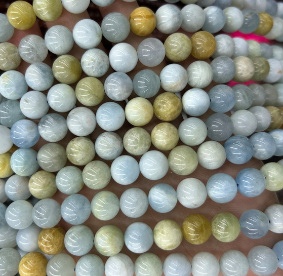 Auf einem ~38cm Strang sind ~60 Stück echte Aquamarin Edelsteinperlen aufgefädelt.